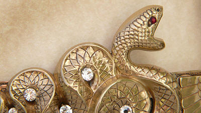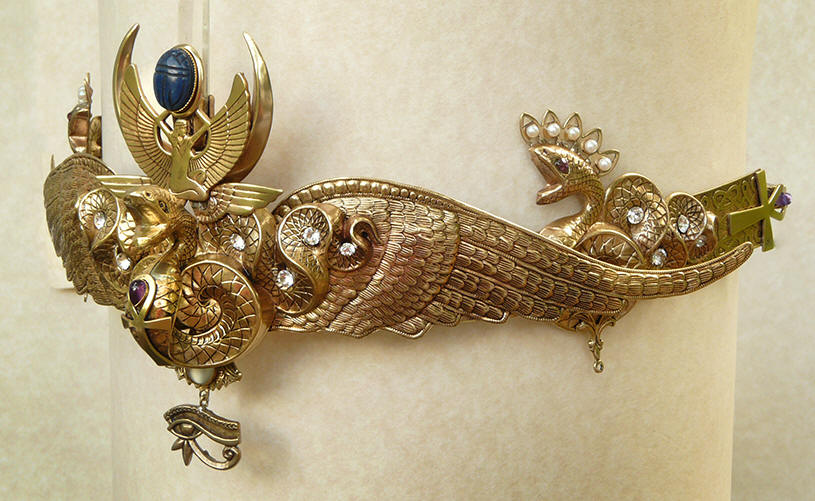 supports the Moon. Set with a carved quartz Scarab,